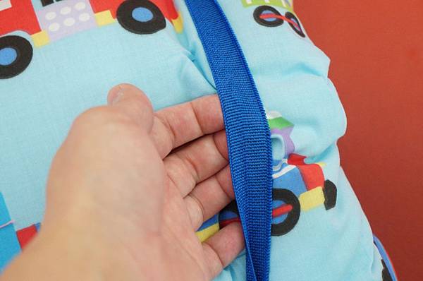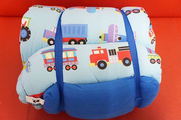 整體是用捲收的方式設計,另給兩條帶子可以綁枕頭!